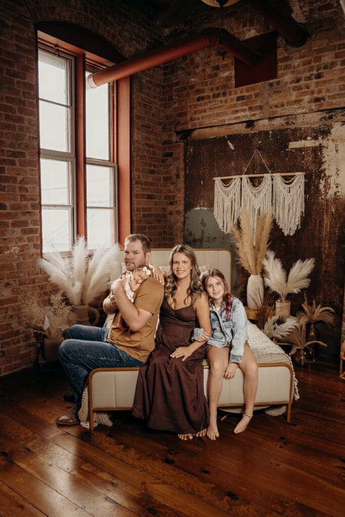 In the studio, we focus on your family as a whole. There is a gorgeous bed to take family photos on, a beautiful antique bassinet, and a prefectly styled rustic boho studio. The session will begin with the family, some posed, some prompted. Mom and dad will each have a moment to snuggle the baby, and of course we can include siblings. After those key shots are snapped it’s time for the babies close up. The studio offers more options for posed portraits of your little one. Perfect to get all the details of those tiny fingers and toes.